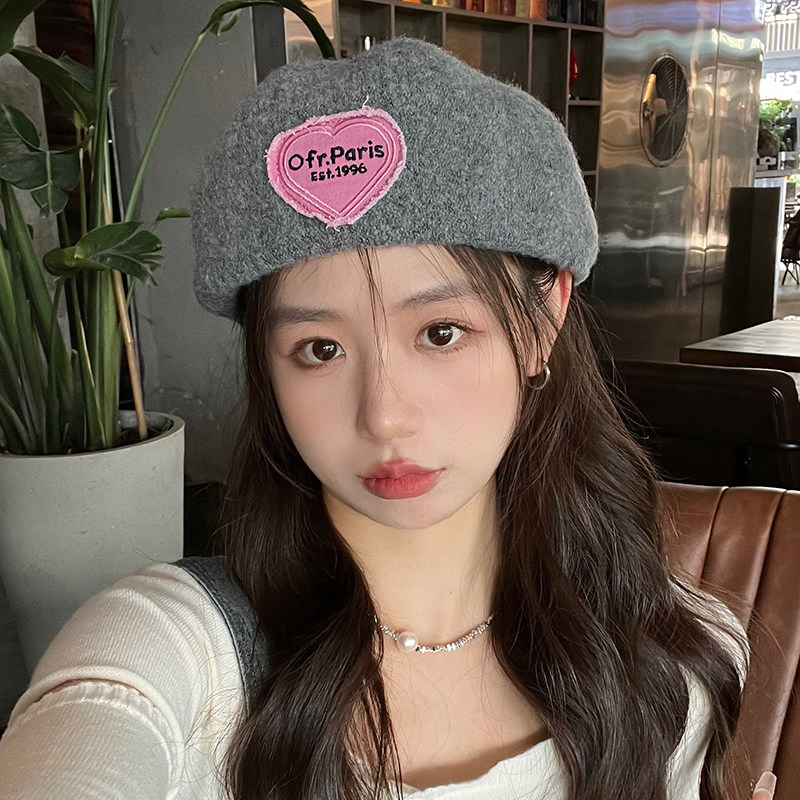 大头围贝雷帽子女秋冬羊毛呢甜美爱心贴布反戴前进帽显脸小画家帽