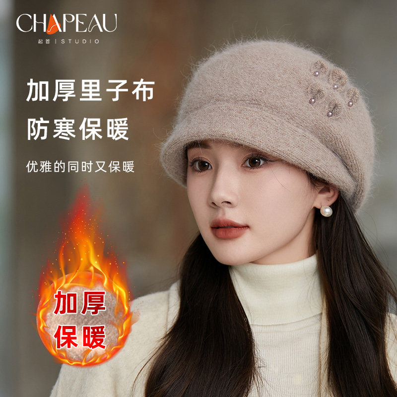 兔毛帽子女冬季妈妈保暖套头帽中老年百搭韩版针织包头帽贝雷帽