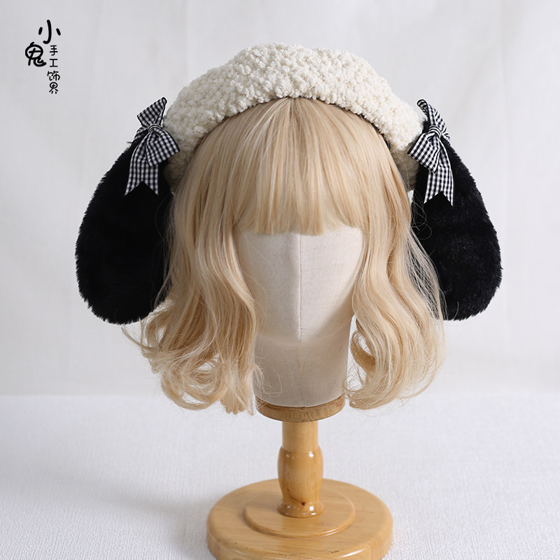 Lolita甜美黑白格子狗狗耳朵帽子手作可爱帕恰狗圆顶毛绒帽贝雷帽
