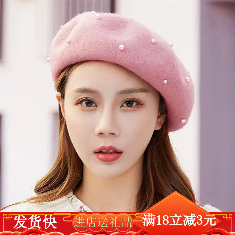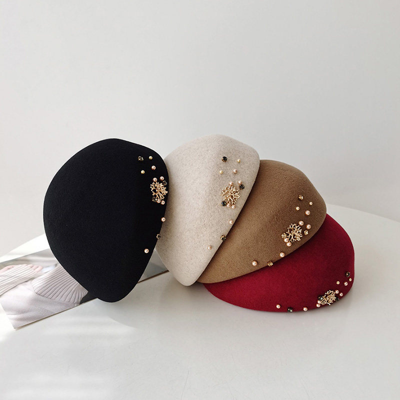 优雅珍珠澳洲羊毛呢贝雷帽子女秋冬时尚高品质画家帽复古百搭礼帽