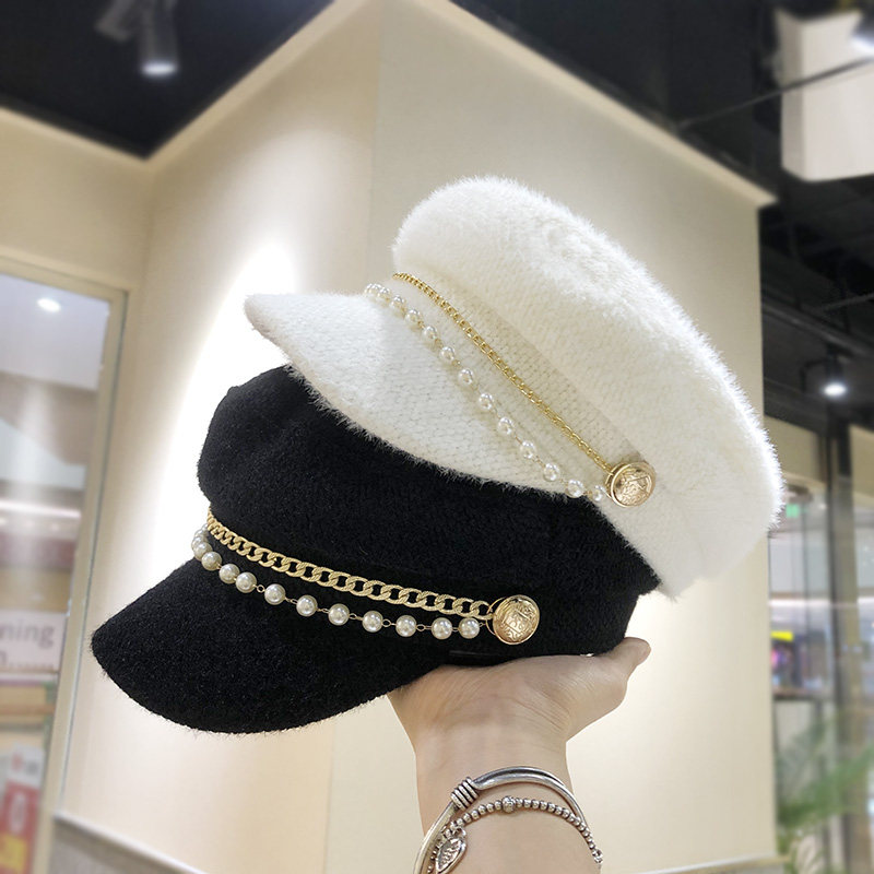 韩国新款秋季潮雪尼尔八角帽鸭舌百搭秋冬帽女纯色南瓜贝雷帽海军