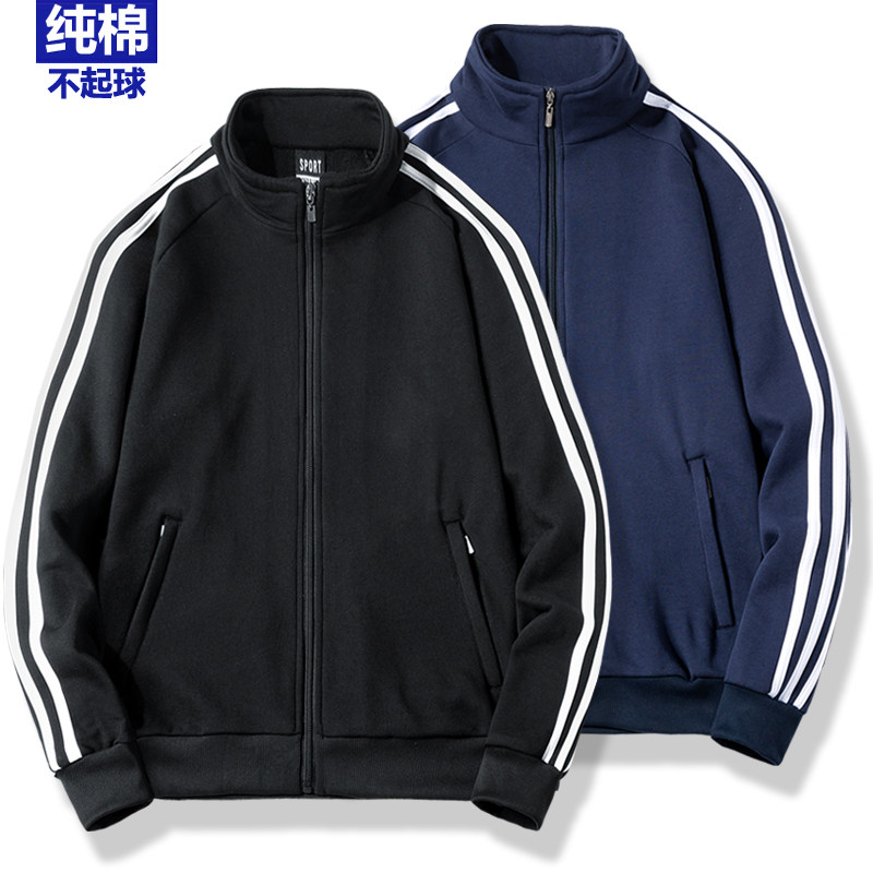 纯棉卫衣外套男款早春宽松加肥加大码条纹开衫三条杠立领运动服装