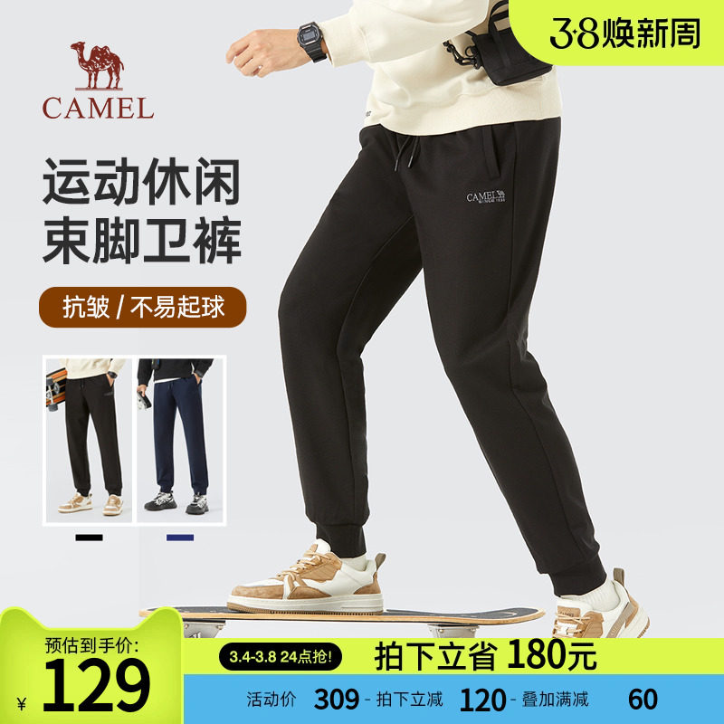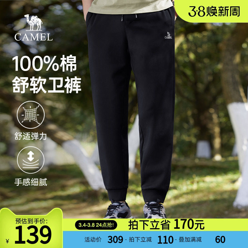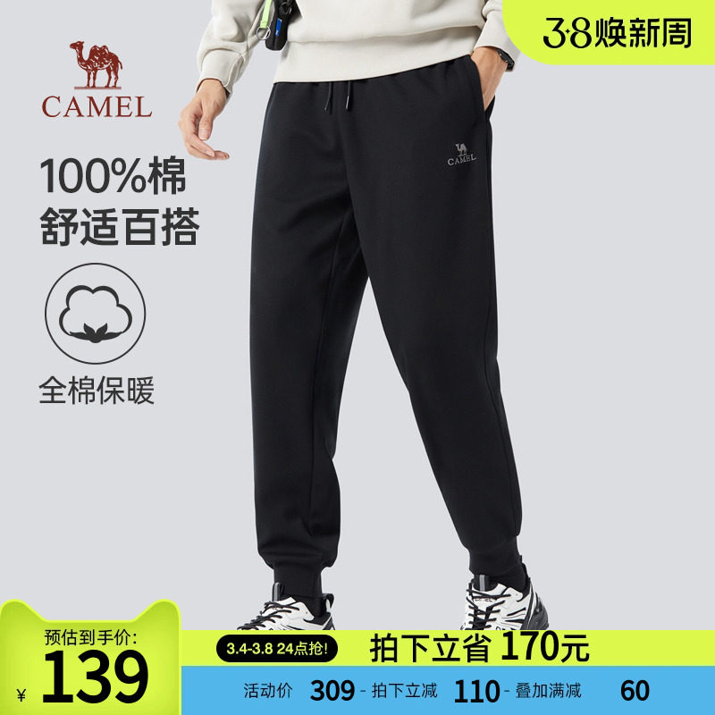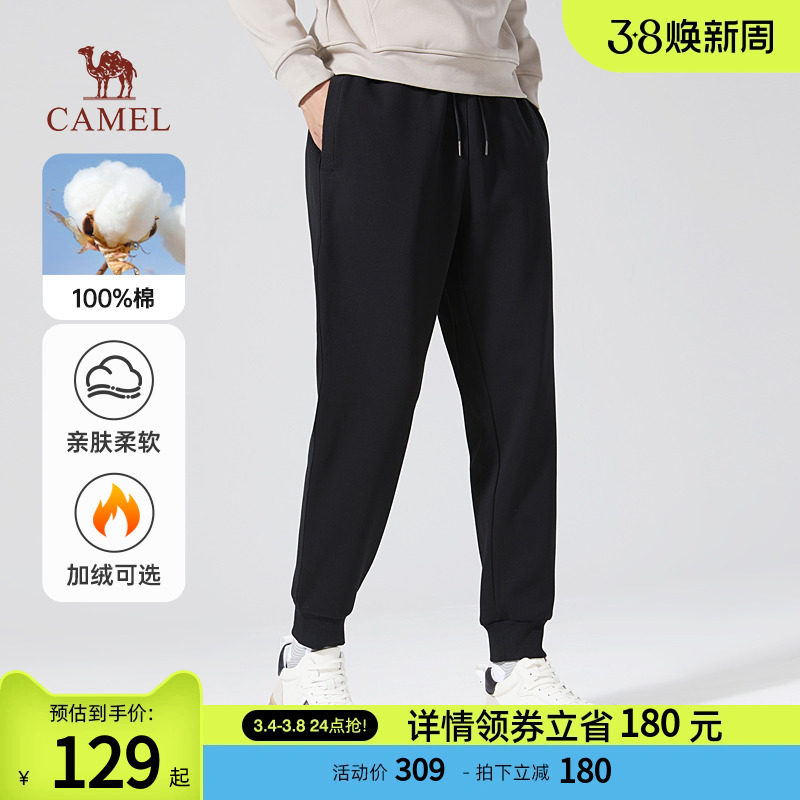 骆驼男装运动裤男士春夏纯棉加绒针织卫裤黑色宽松束脚休闲长裤子