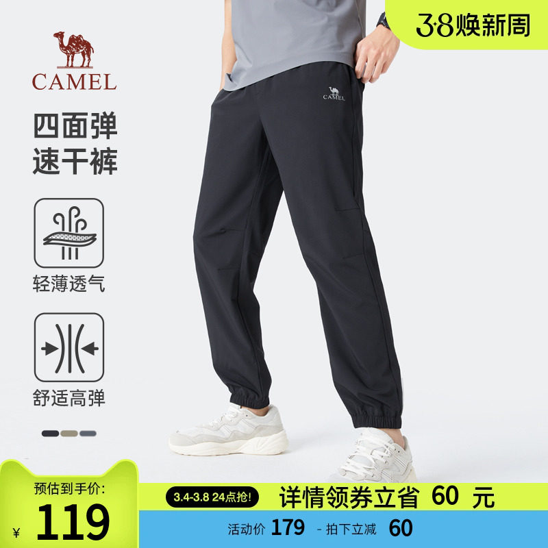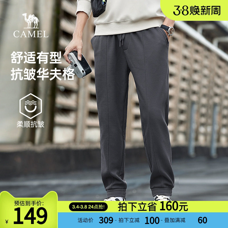 骆驼男装华夫格运动裤男士春夏季户外束脚卫裤黑色宽松休闲长裤子