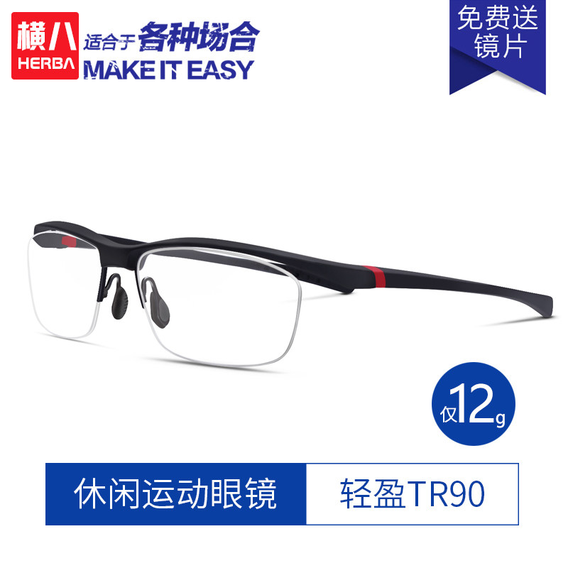 横八运动眼镜半框TR近视眼镜大脸男轻质羽毛球跑步运动休闲半框架