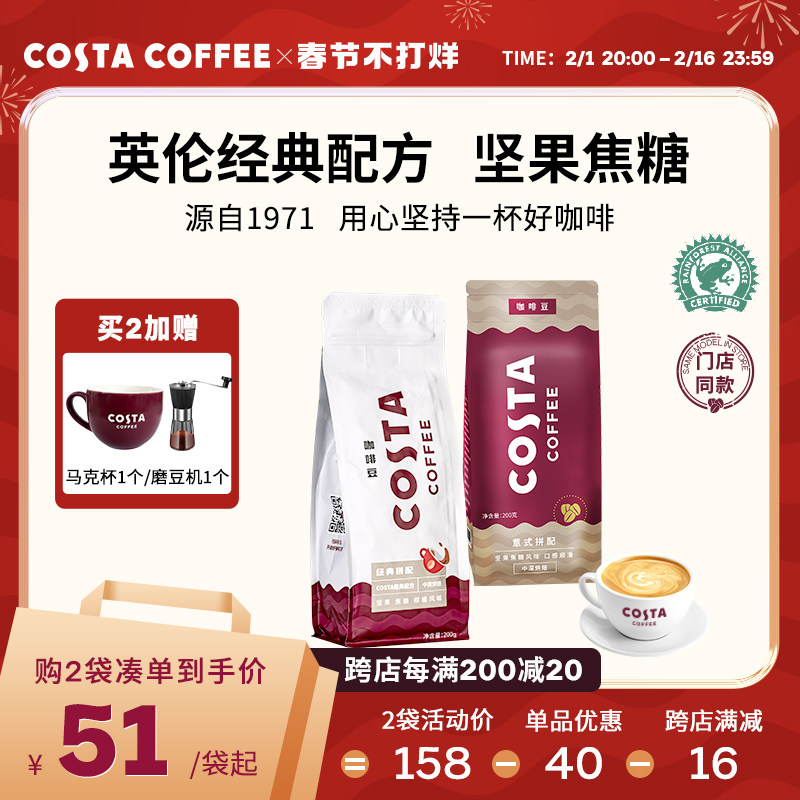 COSTA咖啡豆咖世家意式拼配咖啡进口现磨中深烘焙美式拿铁现磨