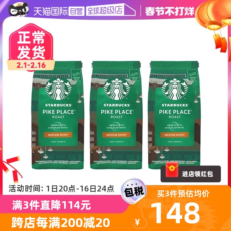 【自营】星巴克门店同款中度烘焙派克市场研磨咖啡豆200g*3进口