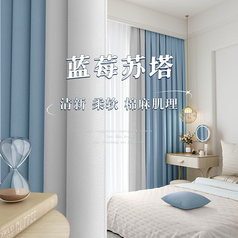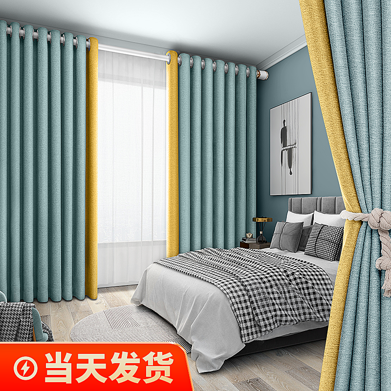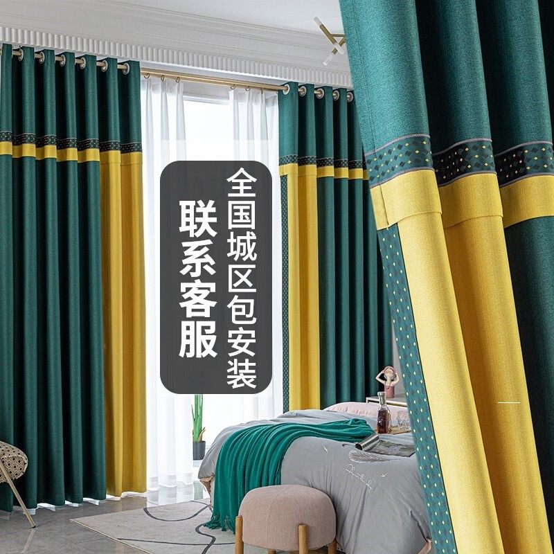 新款无缝拼接客厅窗帘全遮光卧室现代简约防晒加厚棉麻成品一整套