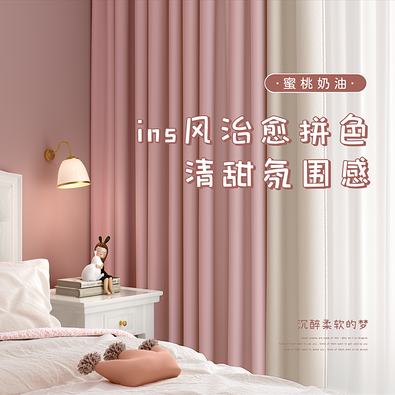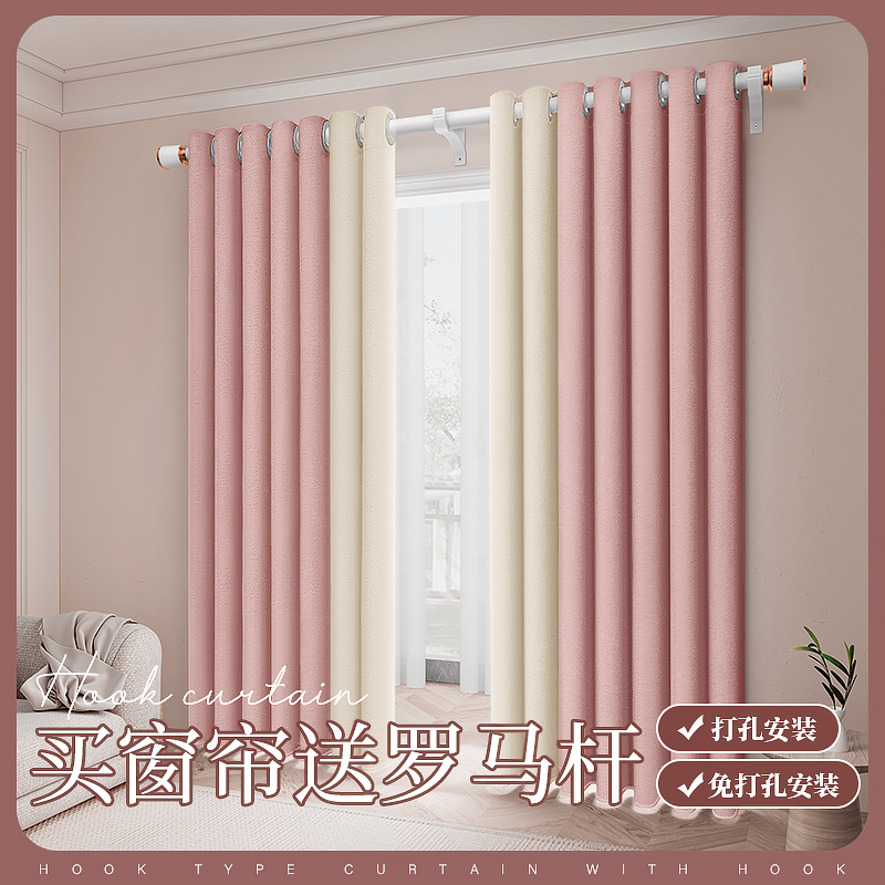 女孩卧室窗帘全遮光简约轻奢挂钩式免打孔安装2022新款儿童房间布