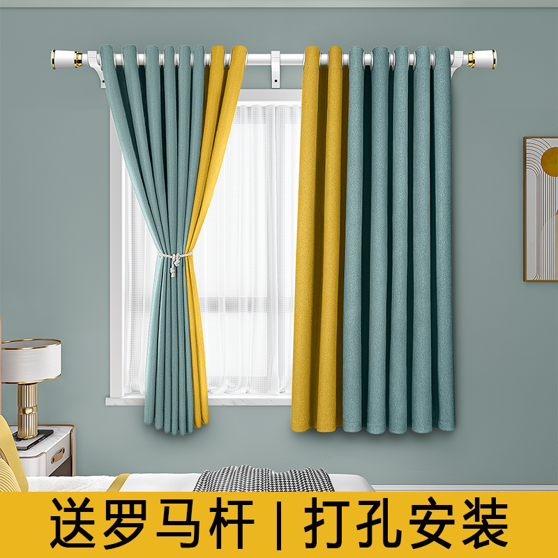 卧室飘窗窗帘免打孔安装伸缩杆一整套家用出租房遮光防晒短帘布帘