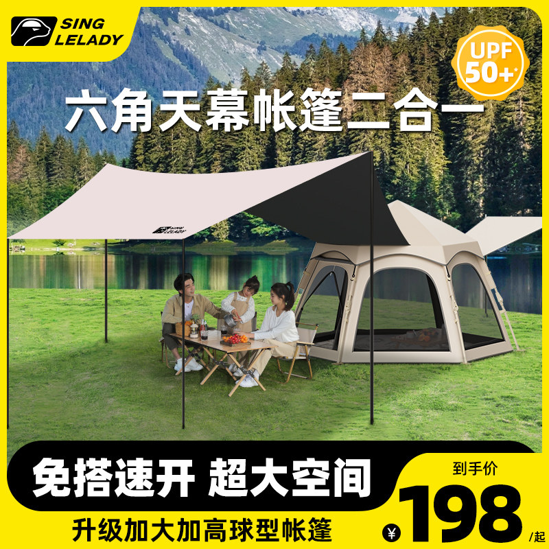 户外天幕帐篷双层全遮光露营野餐防晒防雨凉棚野营遮阳棚六角蝶形