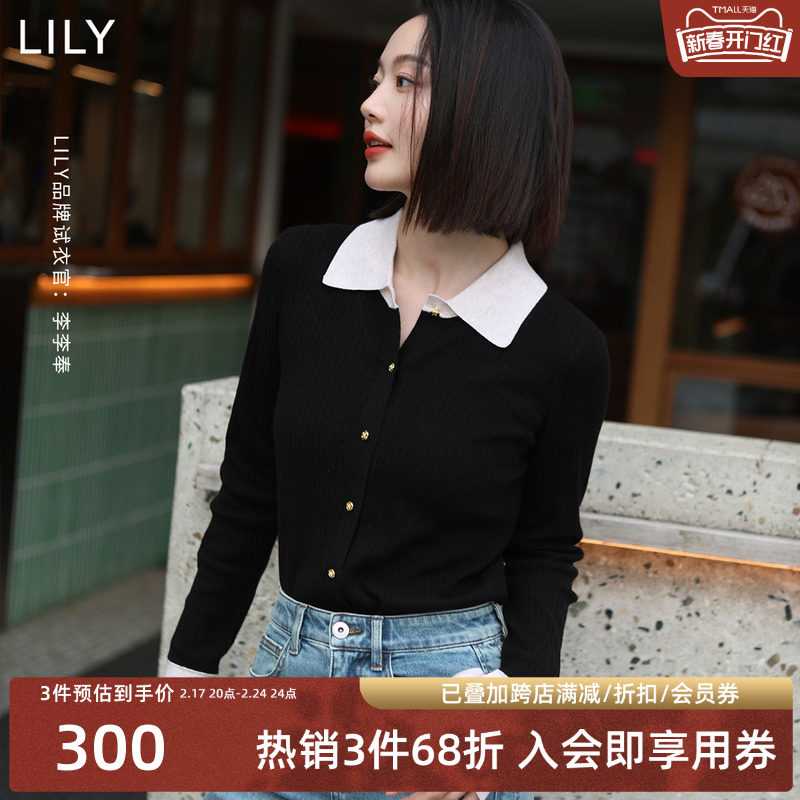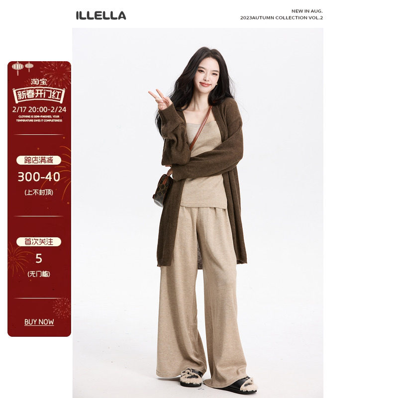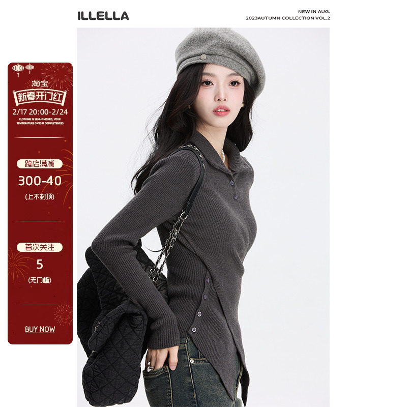 ILLELLA纯色翻领毛针织衫女春秋流行修身不规则燕尾开叉套头上衣