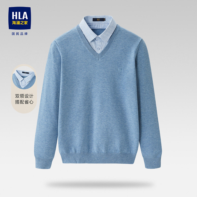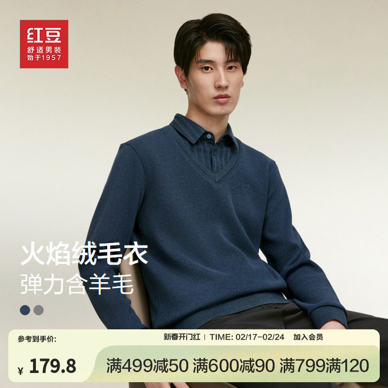红豆毛衣男冬季24秋冬抗起球加绒针织衫V领衬衫领爸爸毛衫假两件