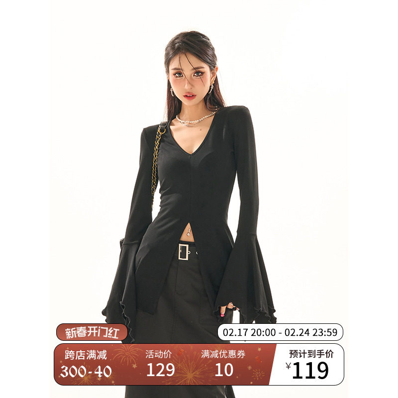 野生zerocircle 黑灰白色针织衫女秋季修身显瘦开叉喇叭袖v领上衣