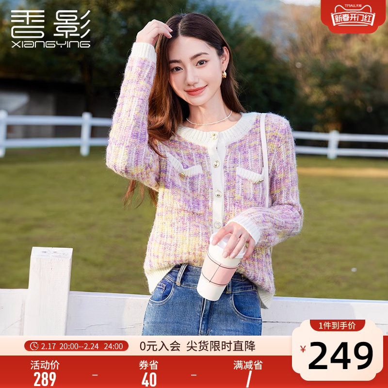 香影紫色小香风针织开衫女2023秋冬季新款法式慵懒风软糯宽松毛衣