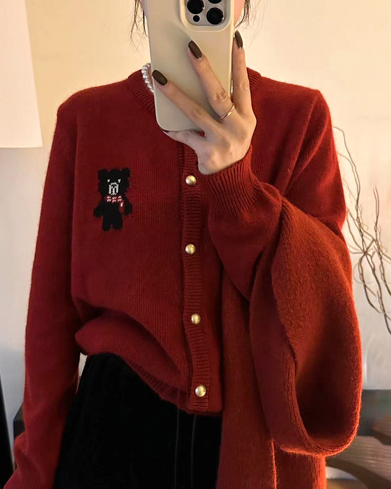 小熊印花浣熊绒针织开衫毛衣外套女欧洲站冬装2023新款欧货女装潮