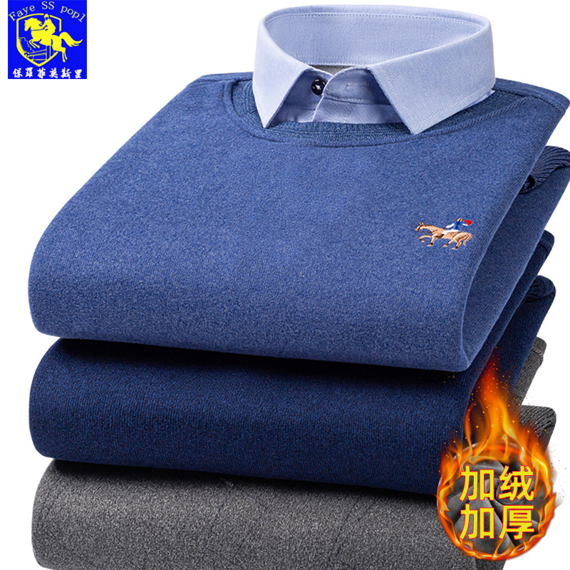 【加绒加厚】雅鹿男士翻领针织衫保暖冬季假两件衬衫领毛衣打底衫