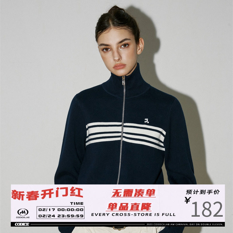 CODICE 23/AW LOGO刺绣条纹短款修身双开拉链开衫高领毛衣针织衫