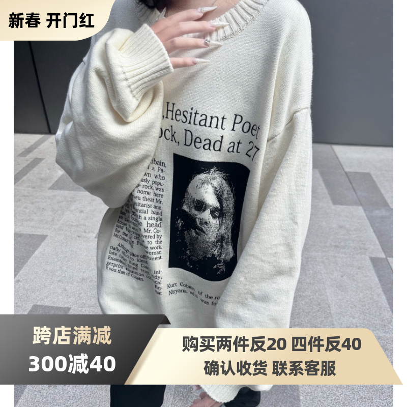 RTIM涅槃复古柯本标语圆领毛衣cleanfit宽松欧美重磅羊毛针织衫潮