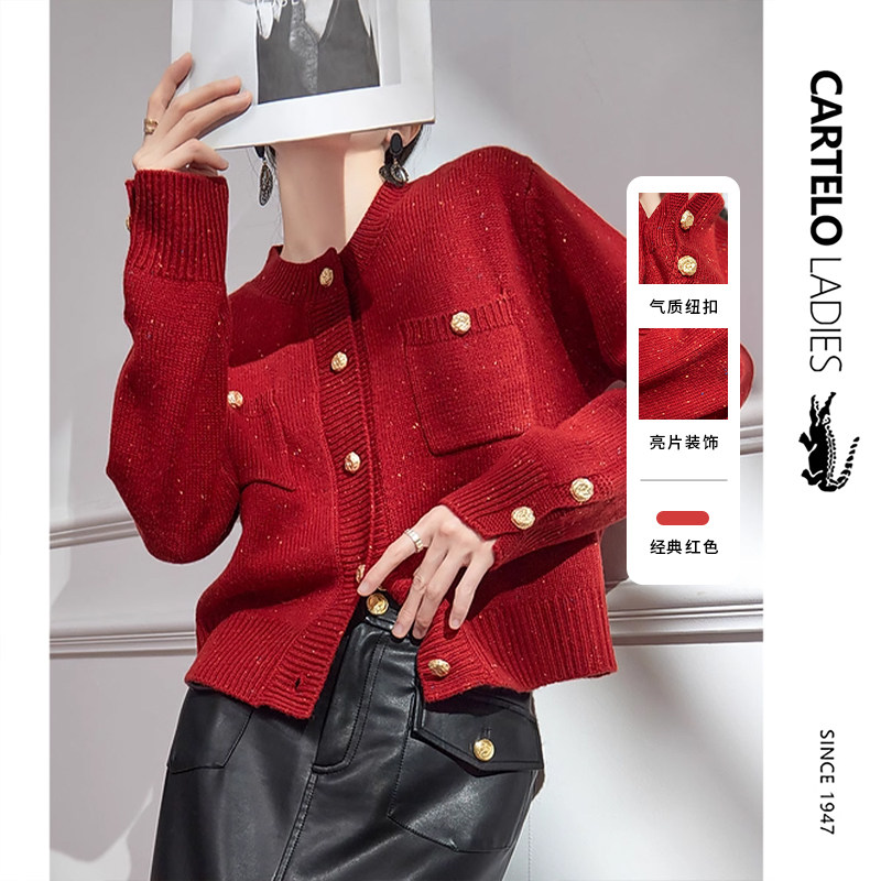 欧货2024春装新款全羊毛圆领钉珠本命年红色针织开衫外套外搭女