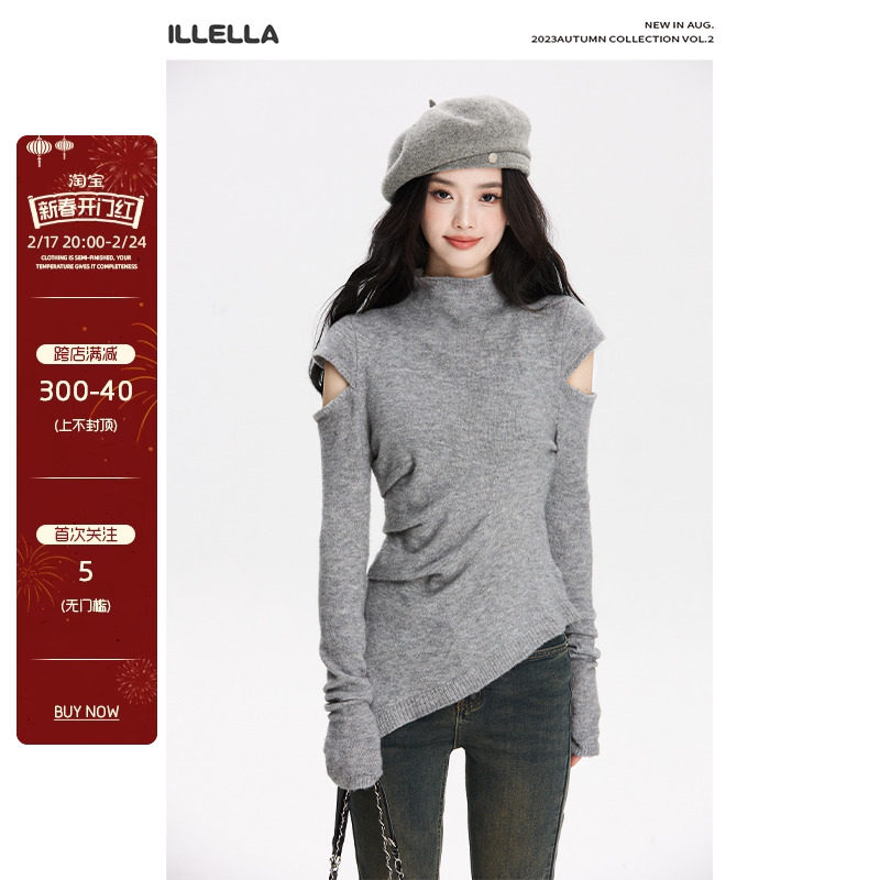 ILLELLA 露肩高领针织衫春秋内搭显瘦不规则小心机设计感打底毛衣
