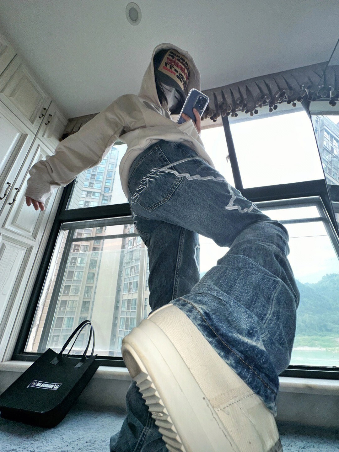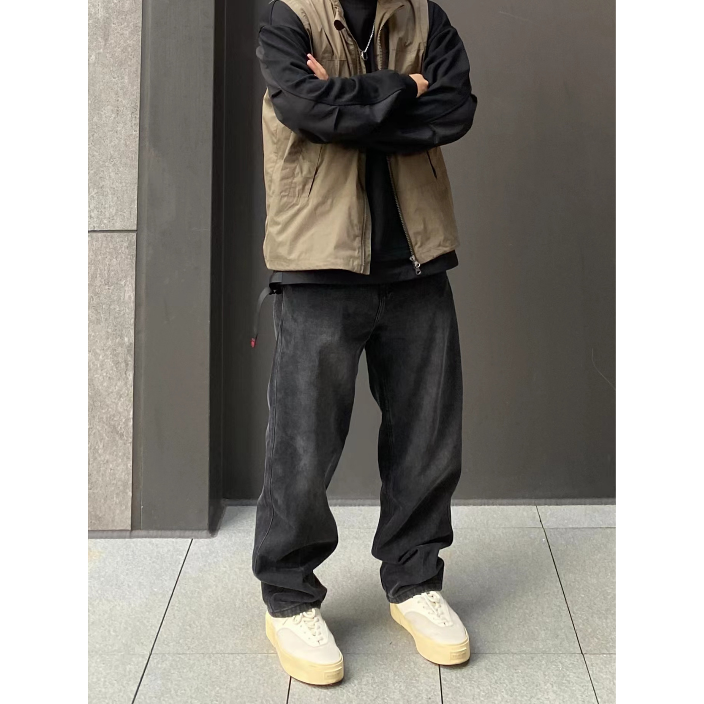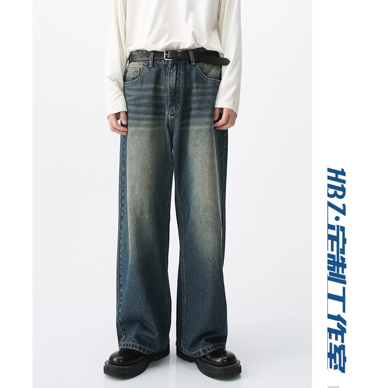 韩国新款男士复古宽松休闲阔腿裤 做脏拖地废土风牛仔长裤男 秋