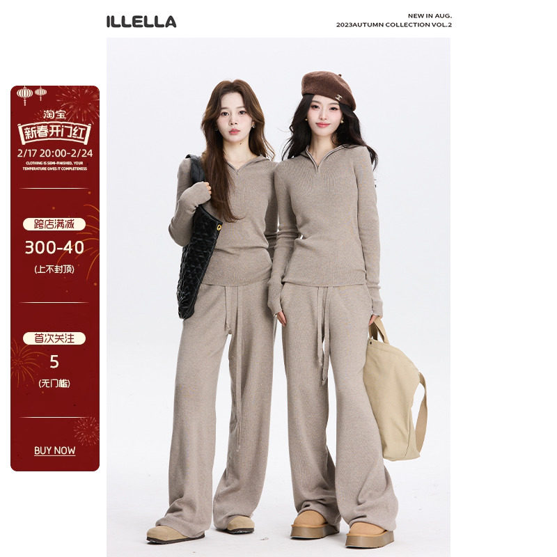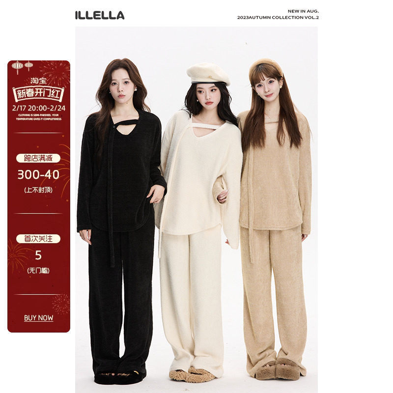 ILLELLA 纯色不规则套装2024春秋休闲慵懒风宽松圆领上衣阔腿裤女