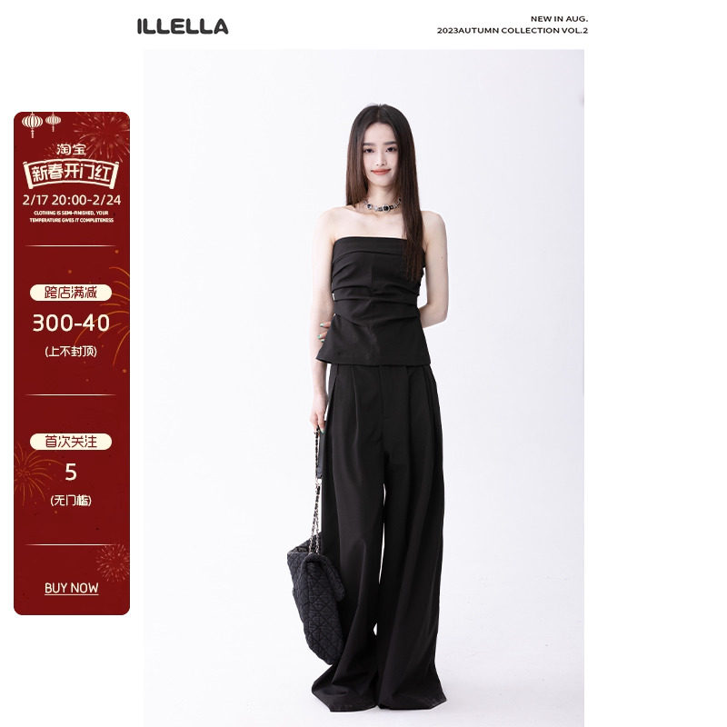 ILLELLA 黑色两件套春夏抹胸休闲阔腿高腰休闲裤无袖上衣时尚套装