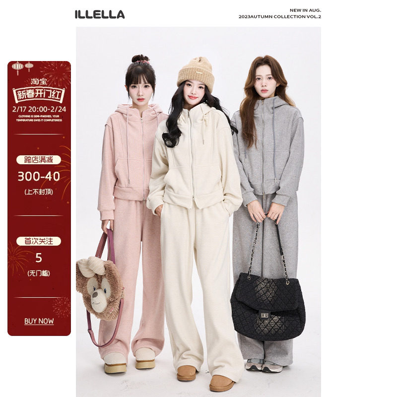 ILLELLA连帽长袖拉链卫衣外套春秋慵懒休闲宽松高腰阔腿长裤套装