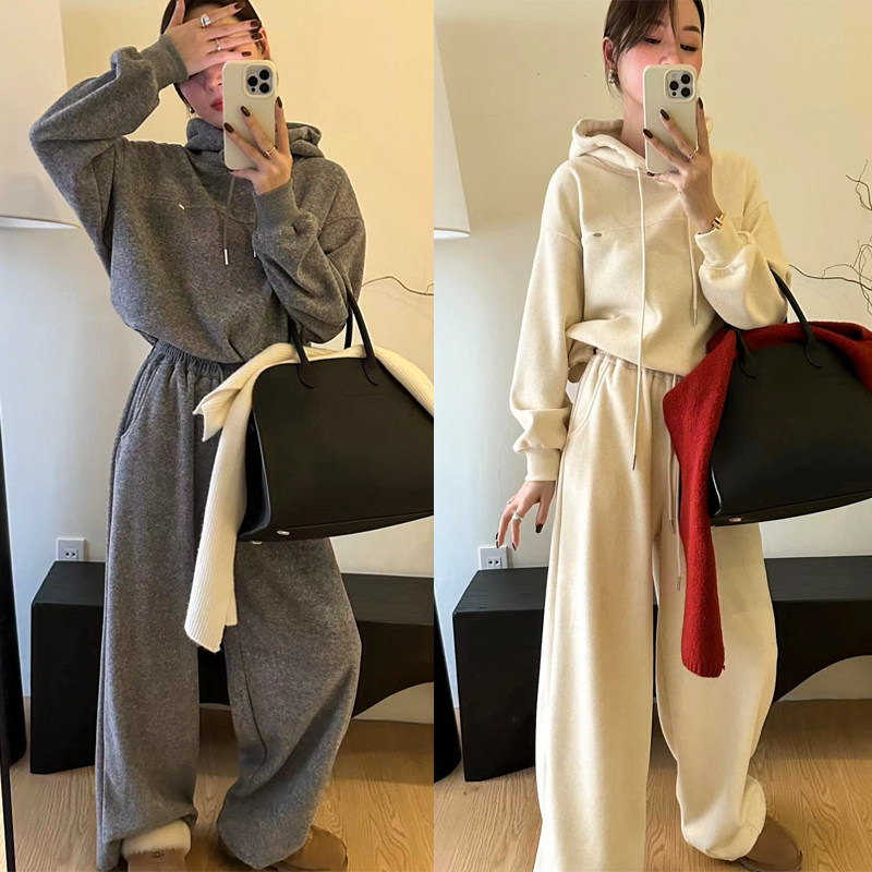金属贴标连帽加绒卫衣阔腿裤两件套装女欧洲站冬装2023新款欧货潮