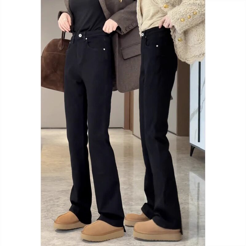 黑色微喇开叉牛仔裤女春季新款胖妹妹mm高腰宽松显瘦直筒阔腿长裤