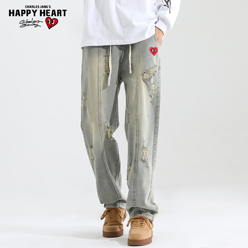 查尔斯桃心 破洞牛仔裤春秋冬季2023新款宽松直筒阔腿休闲长裤子