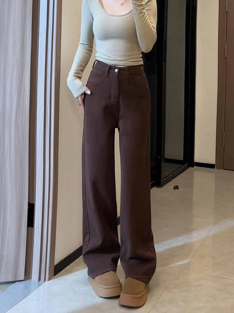 加绒加厚美拉德直筒牛仔裤女秋冬季大码胖妹妹mm宽松显瘦阔腿长裤