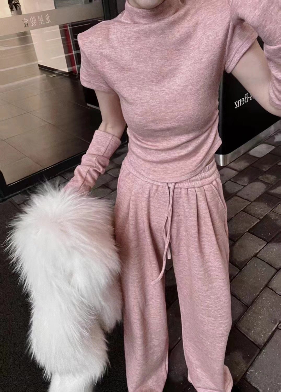 2023冬季新款短款辣妹短袖T恤袖套羊绒阔腿长裤美式两件套装女
