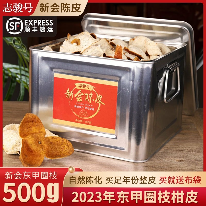 新会陈皮2023年东甲老树圈枝冬后大红柑皮正宗广东特产500g铁罐装