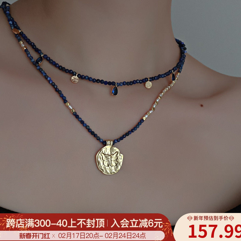 原创永恒青金石蓝色拼接珍珠项链金币硬币吊坠女款轻奢小众锁骨链