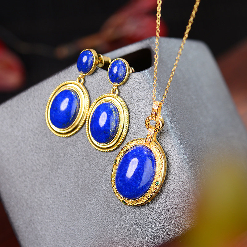 洛可可小姐の青金石 复古大颗粒珠宝玫瑰切925银开口戒指耳钉项链