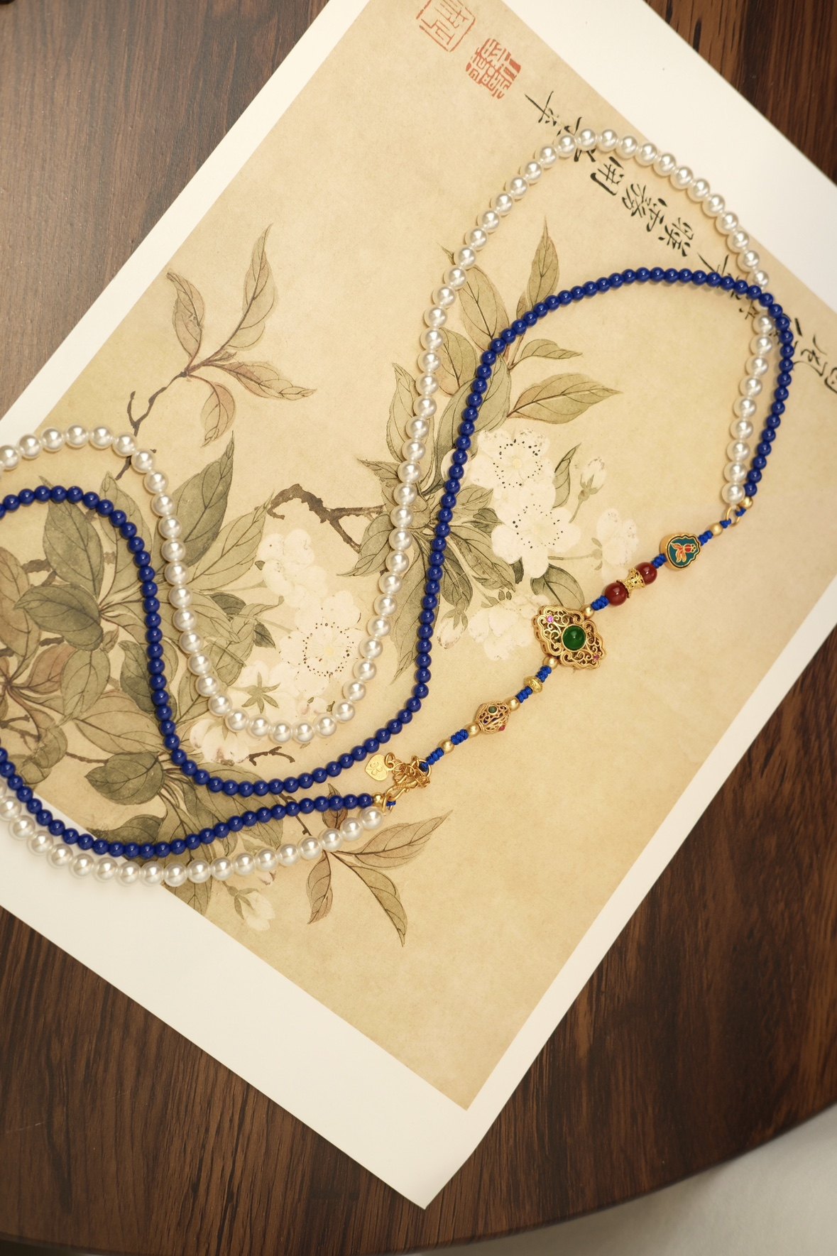 国潮青金石双层贝珠项链毛衣链编制毛衣链长项链