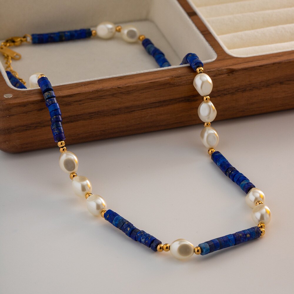 vintage复古中古风天然珍珠石头项链 不锈钢青金石淡水珍珠项链