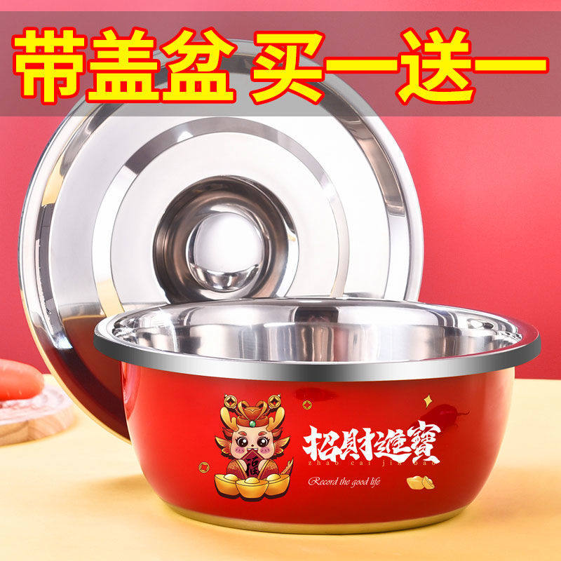 带盖304不锈钢盆加厚家用厨房发面和面盆装汤盆子洗菜盆过年喜庆