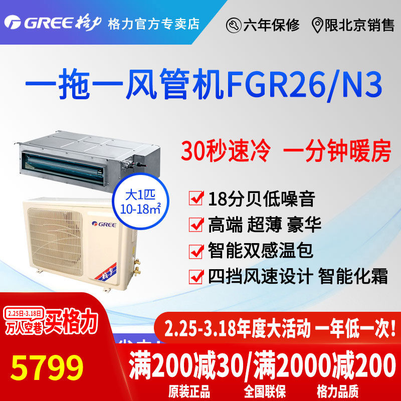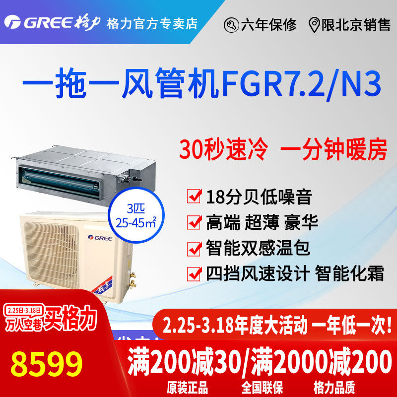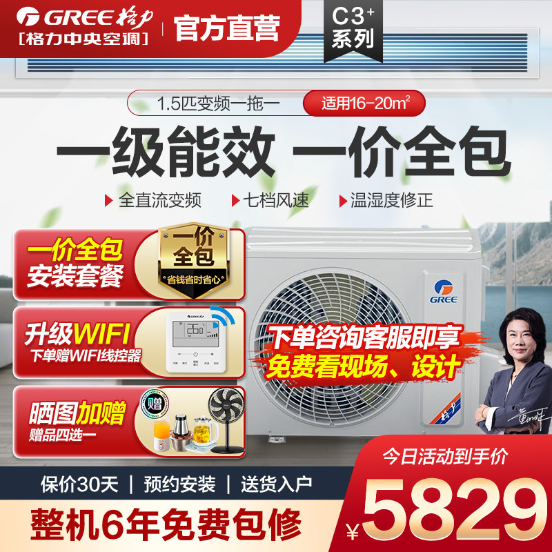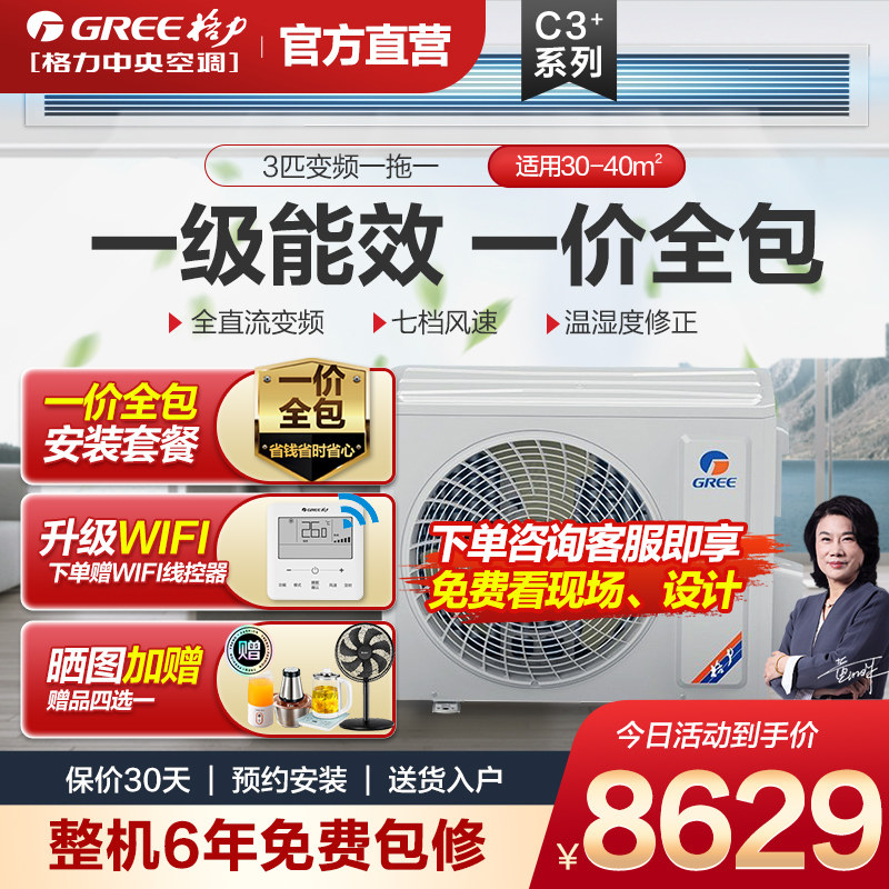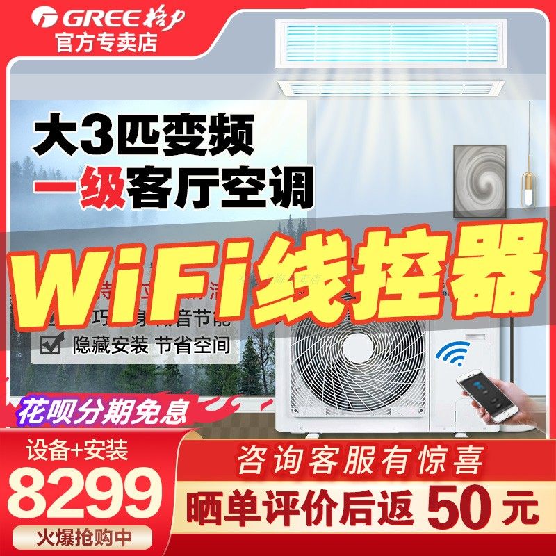 格力客厅中央空调风管机家用卧室一拖一大3匹一级能效变频冷暖C3+