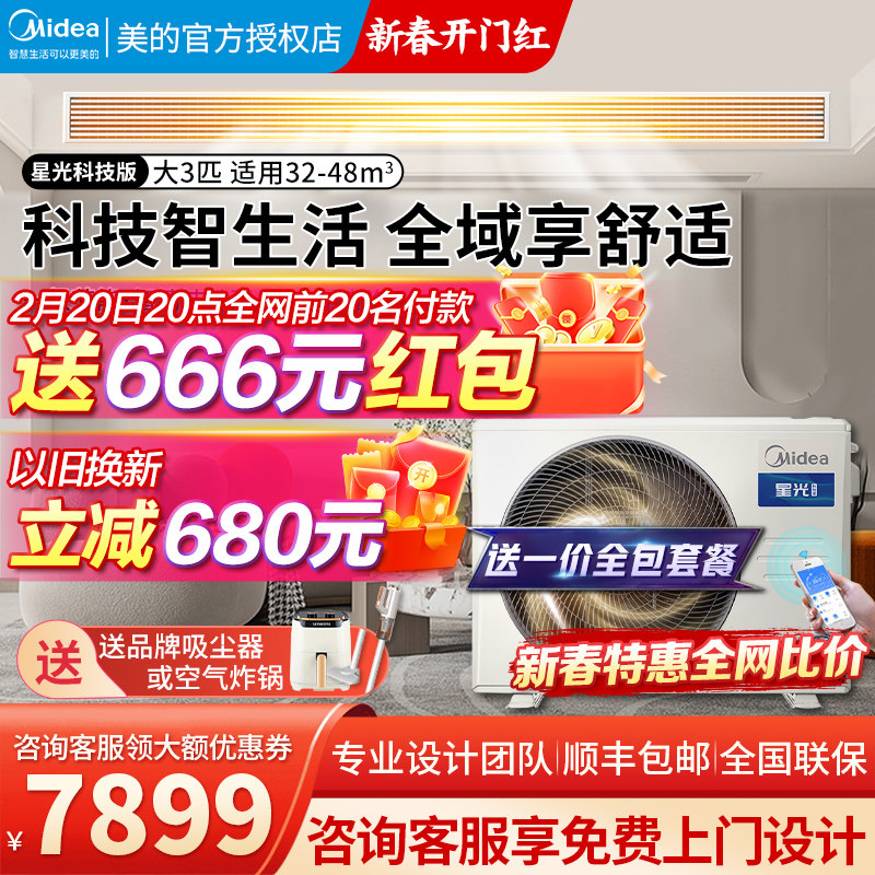 美的客厅风管机空调3匹全直流一级1.5P卧室485智能72T星光科技版