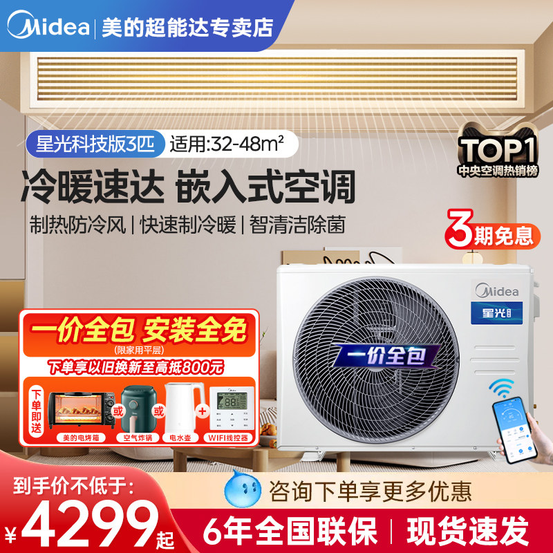 美的中央空调大3匹家用风管机一拖一全屋智能一级变频星光科技版