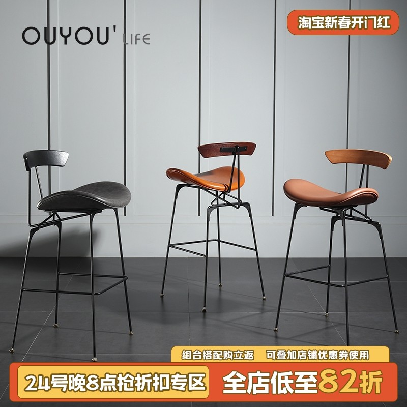 北欧铁艺高脚凳吧椅复古轻奢家用吧台椅高椅子咖啡厅皮靠背酒吧凳