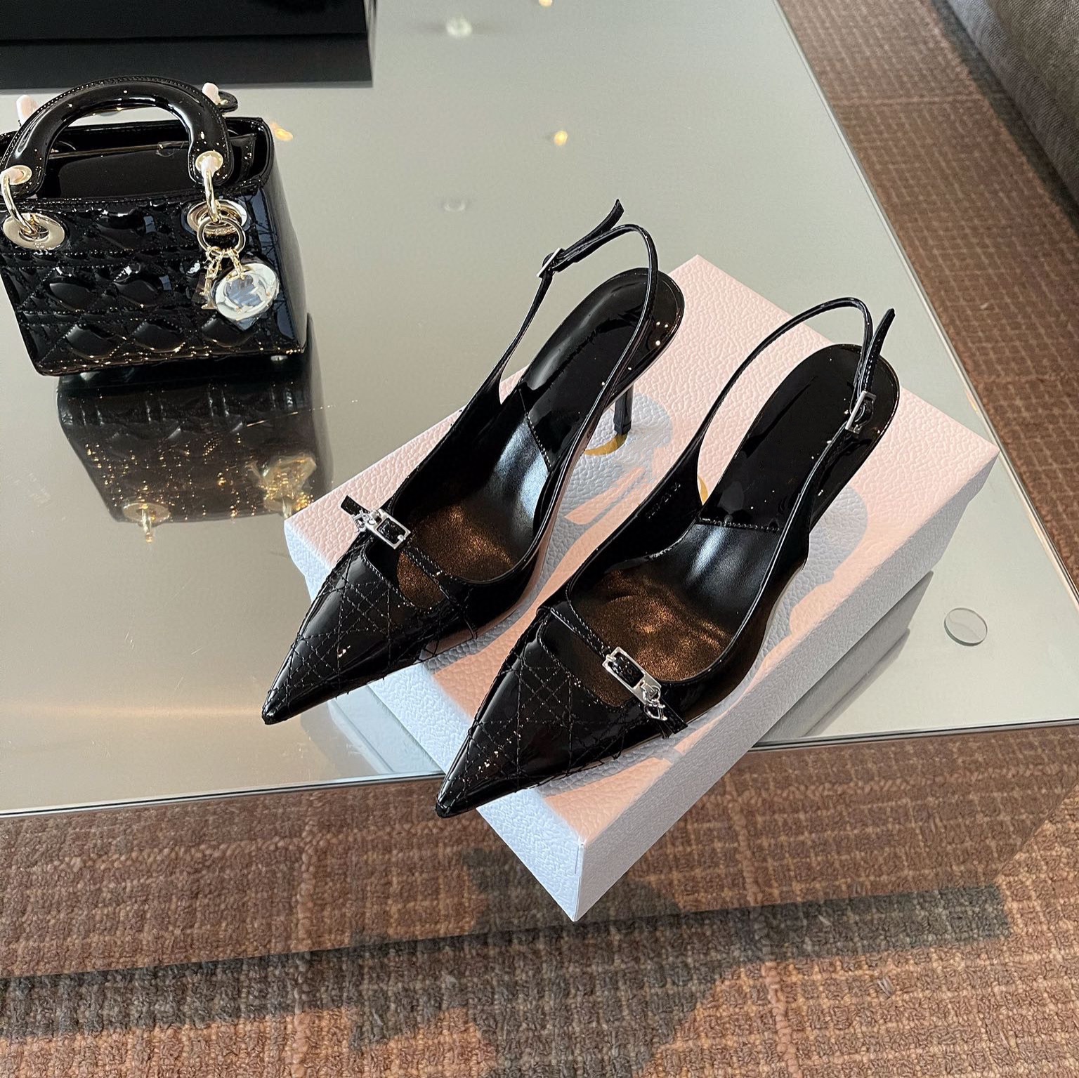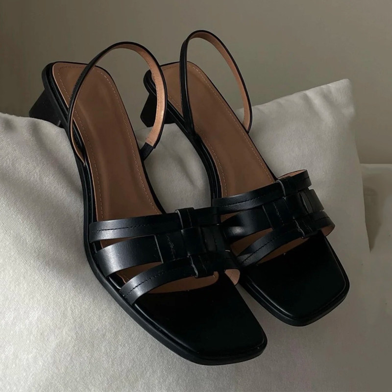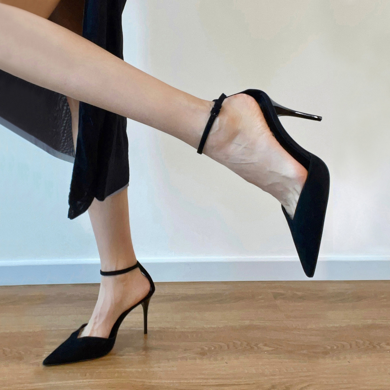 2022新款气质中古高跟鞋女尖头侧空设计感细跟一字扣后绊带凉鞋女