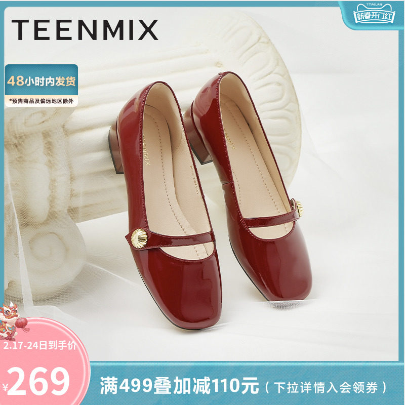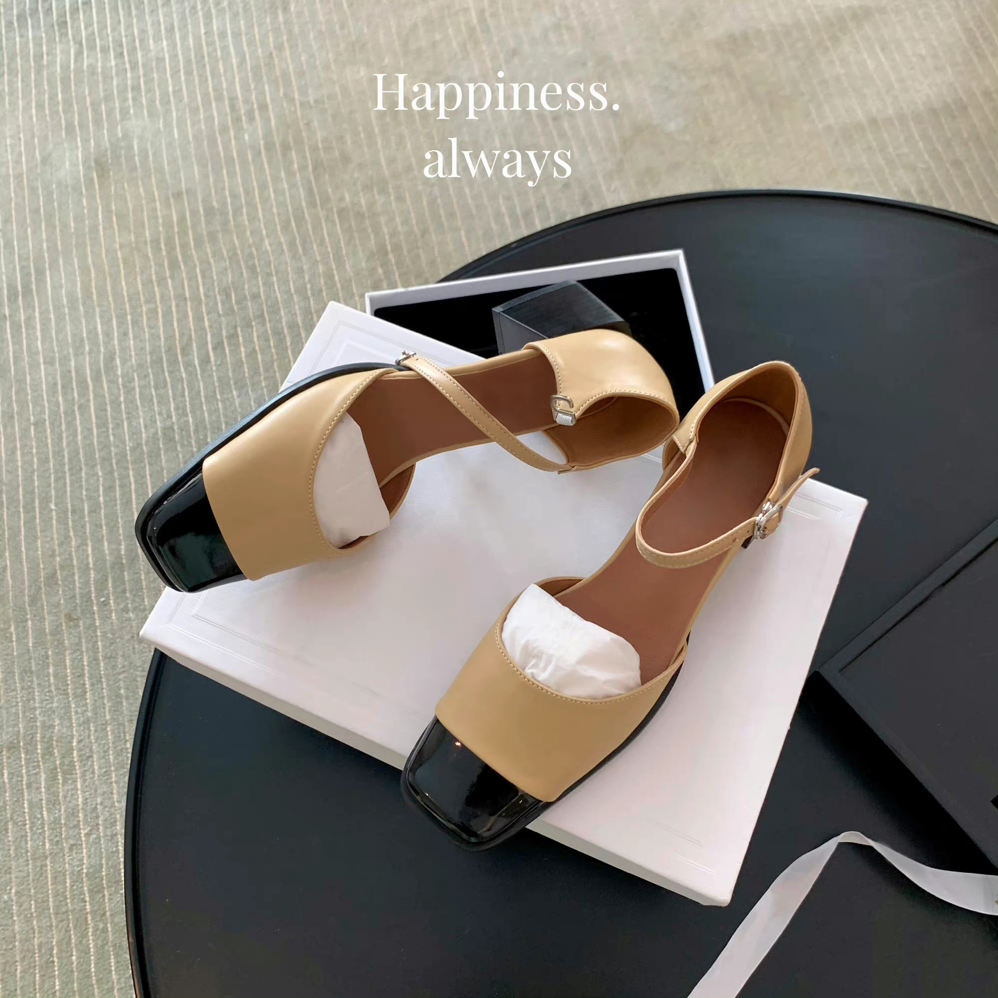 春季拼色方头浅口中空优雅粗跟一字扣带单鞋女真皮玛丽珍高跟凉鞋