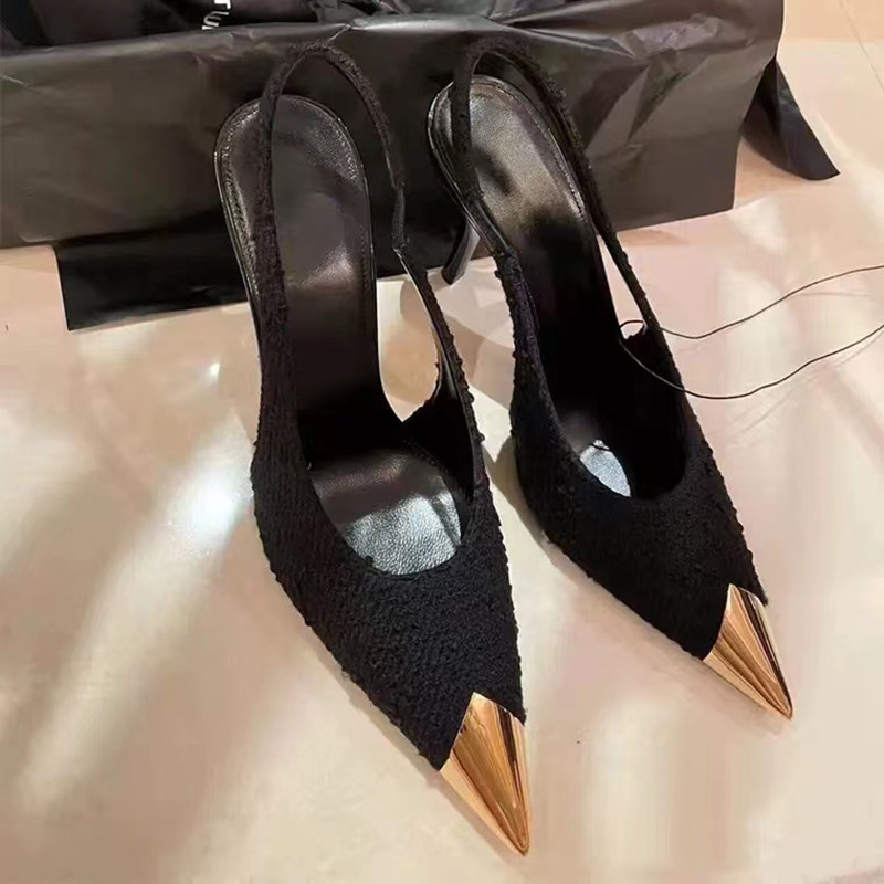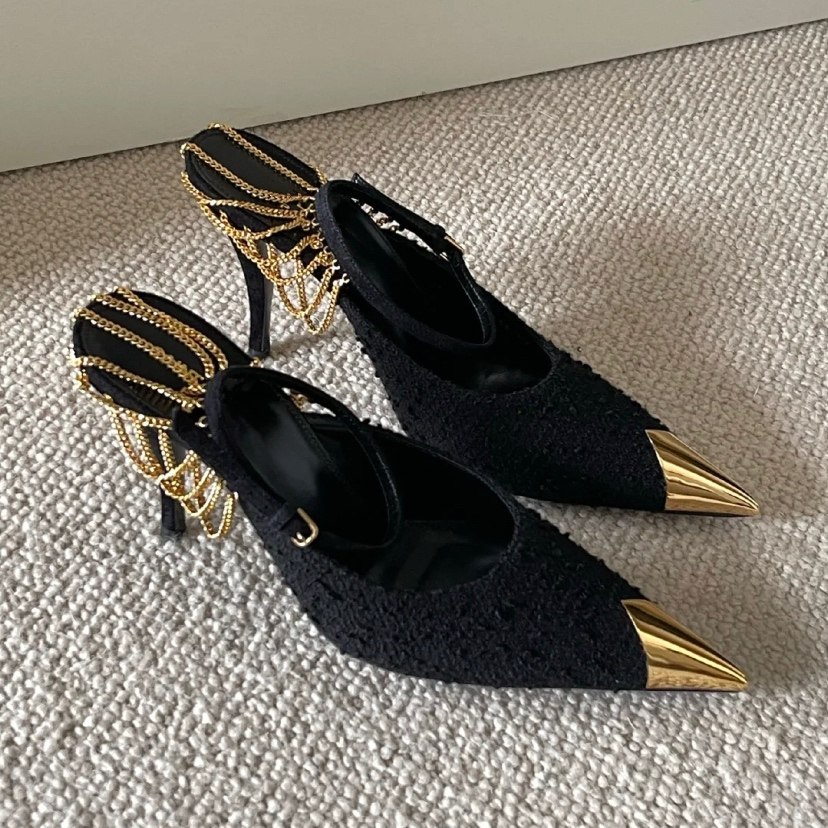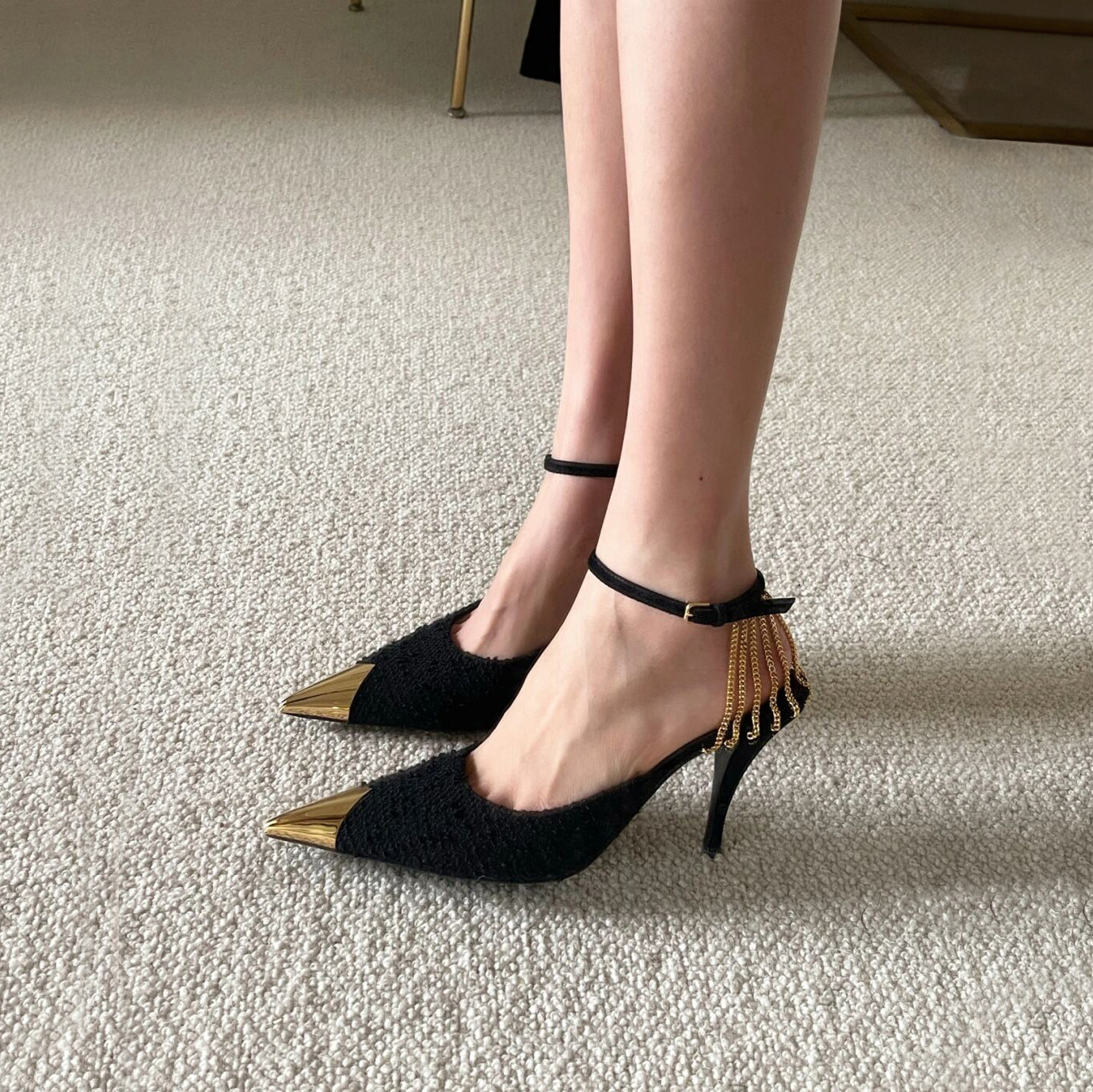 2022新款浅口气质凉鞋女高跟时髦链条一字带金属尖头细跟铁头女鞋