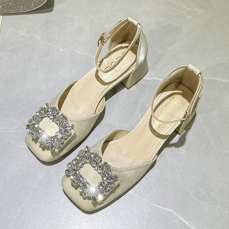接吻猫方头水钻优雅气质高跟鞋精致大气一字带凉鞋女