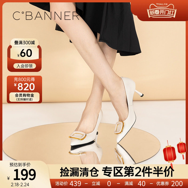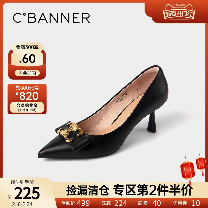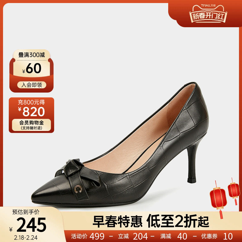 千百度女鞋蝴蝶结高跟浅口单鞋细跟尖头舒适时尚简约优雅气质鞋子