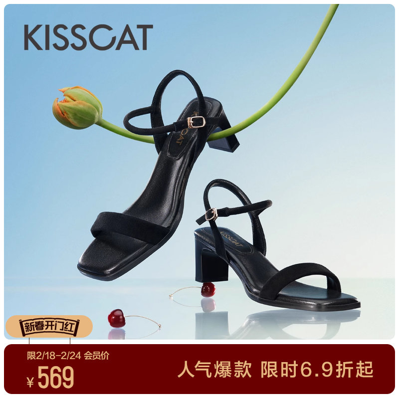 接吻猫[软枕系列]夏季新款简约高跟鞋羊绒粗跟鞋一字带凉鞋女
